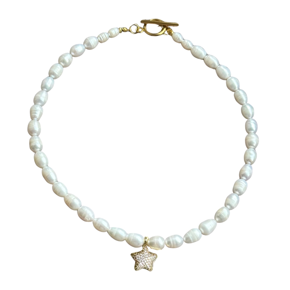 Նուրբ փայլով մարգարիտե վզնոց՝ զարդարված շողացող դետալներով՝ առավել նուրբ տեսքի համար։
